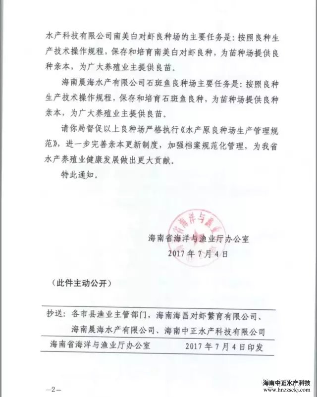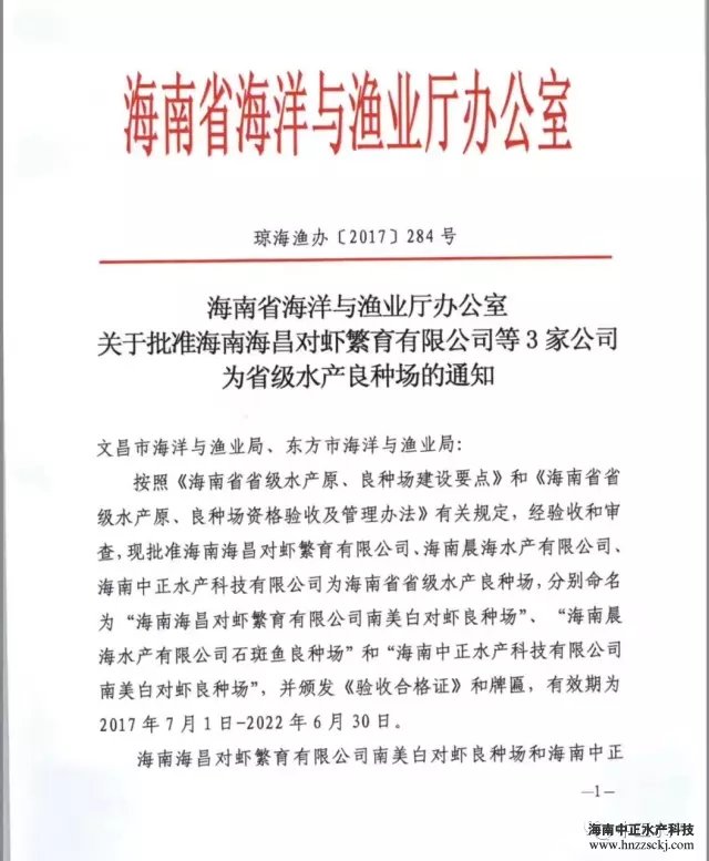 2017年7月4日,海南省海洋与渔业厅办公室正式下发通知,批准华体会·官方版网站登录入口为海南省省级水产良种场,命名为“华体会·官方版网站登录入口南美白对虾良种场”!