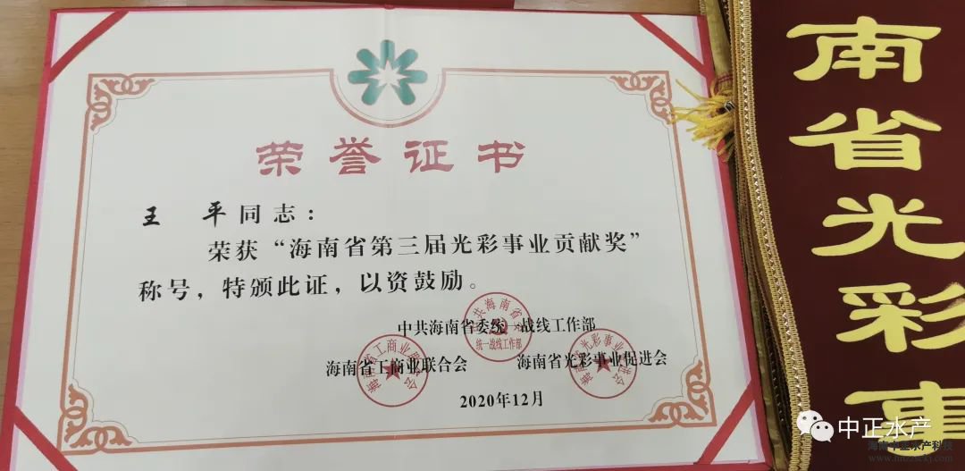 【企业荣誉】中正水产王平副总裁荣获“海南省第三届光彩事业贡献 |