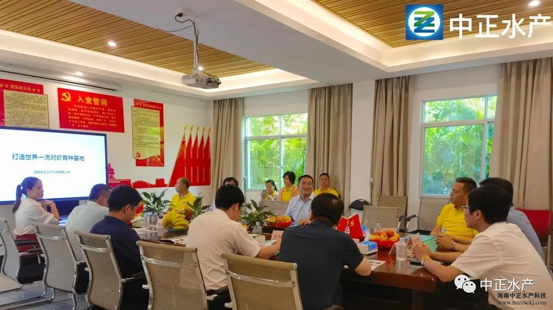 王平副总裁汇报了中正公司近年来的生产经营情况,在生物安保防控、生态育苗、尾水治理等方面取得的成绩,重点介绍了中正南美白对虾良种选育进度、对虾育种中心的建设情况,以及种业发展的未来规划。