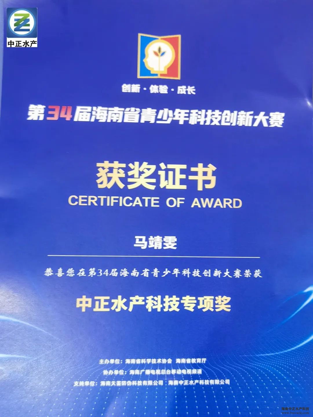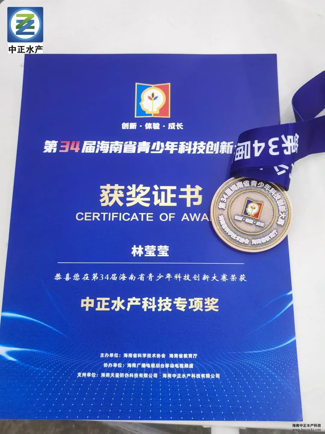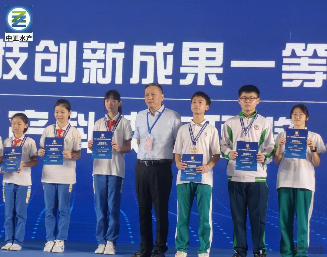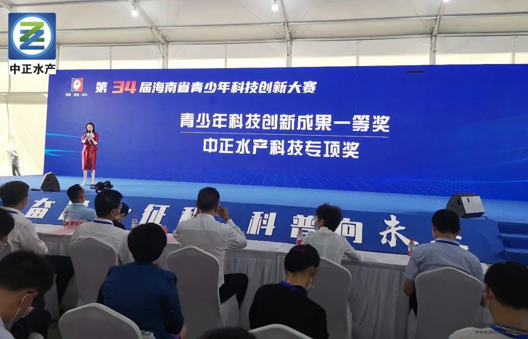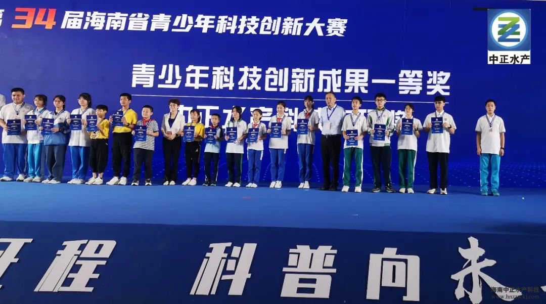 11月20日,在第34届海南省青少年科技创新大赛颁奖活动中,华体会·官方版网站登录入口总裁雷秋凉和海南省科学技术厅副厅长王敏,共同为获奖的同学颁发“中正水产科技专项奖”奖牌和证书,并合影留念。