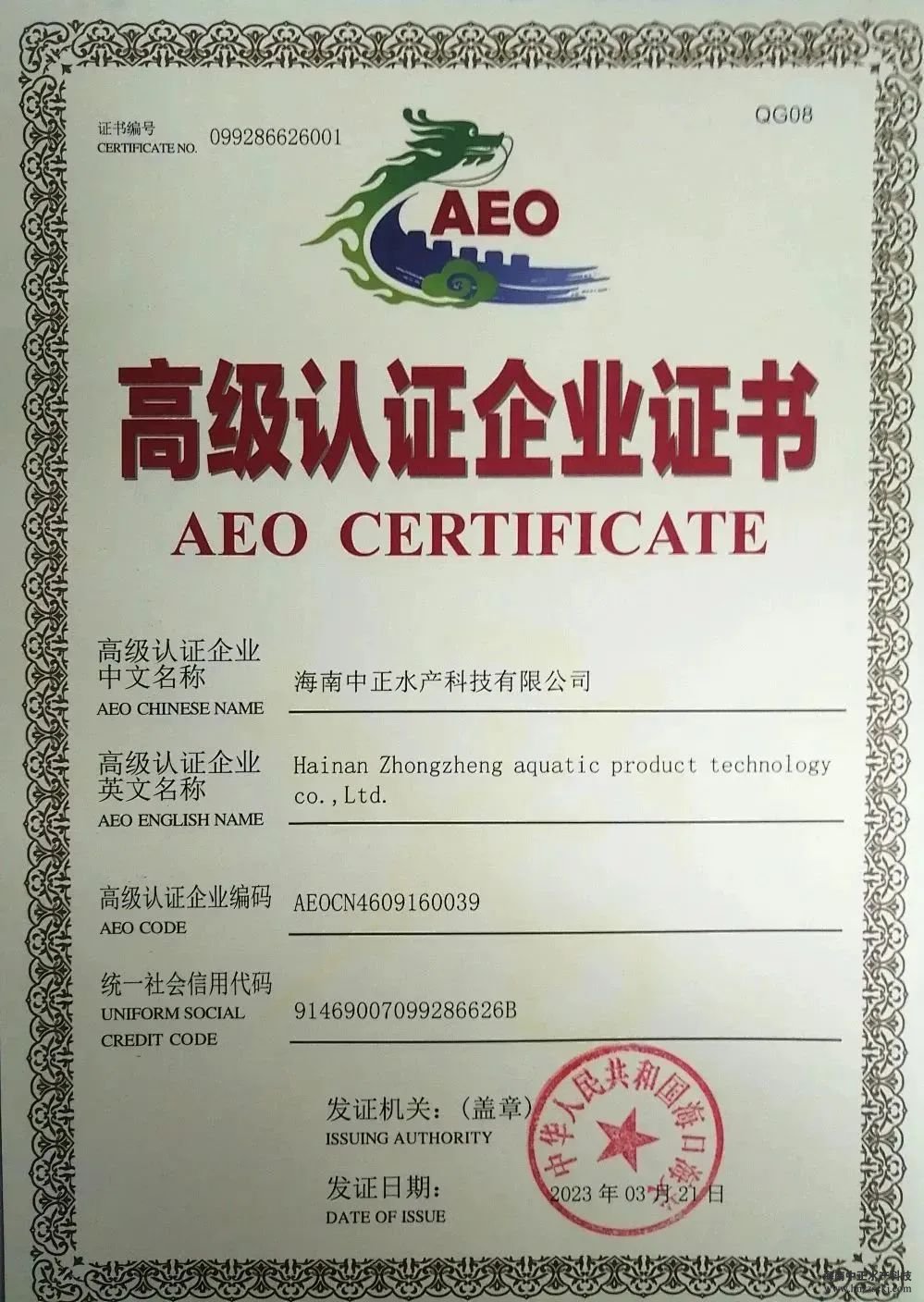 华体会·官方版网站登录入口于2023年3月获批成为海关AEO高級认证企业,成为海南省首家水产种业进出口为主的AEO认证企业。