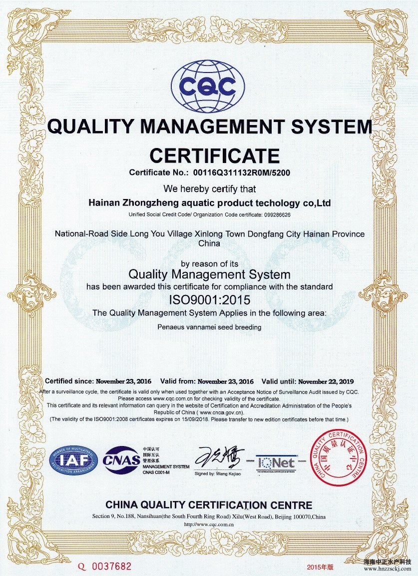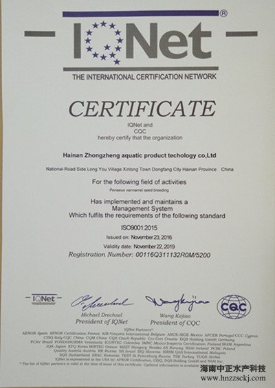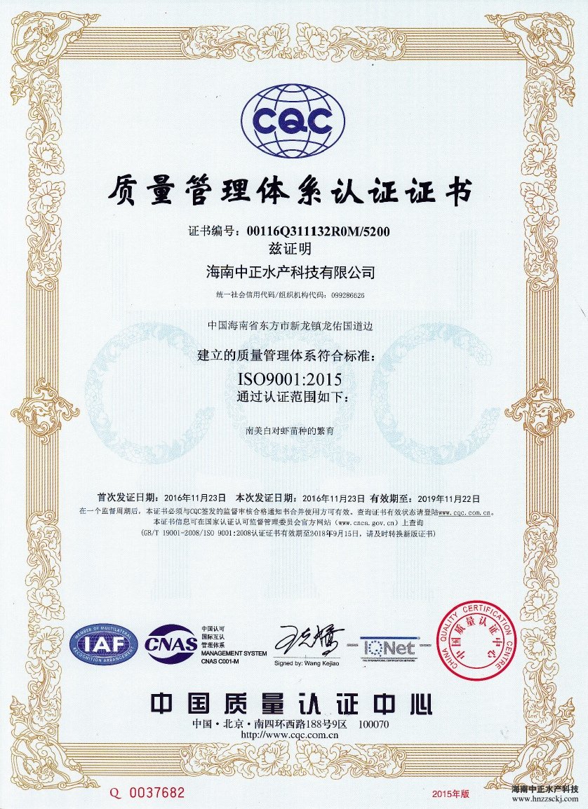 华体会·官方版网站登录入口,继先后荣获中国南美白对虾苗“新锐企业”和“2016中国水产行业十大健康安全种苗品牌”称号后,于2016年12月,又顺利通过了ISO9001:2015国际标准化质量管理体系认证和国际认证联盟(IQNet)质量认证。